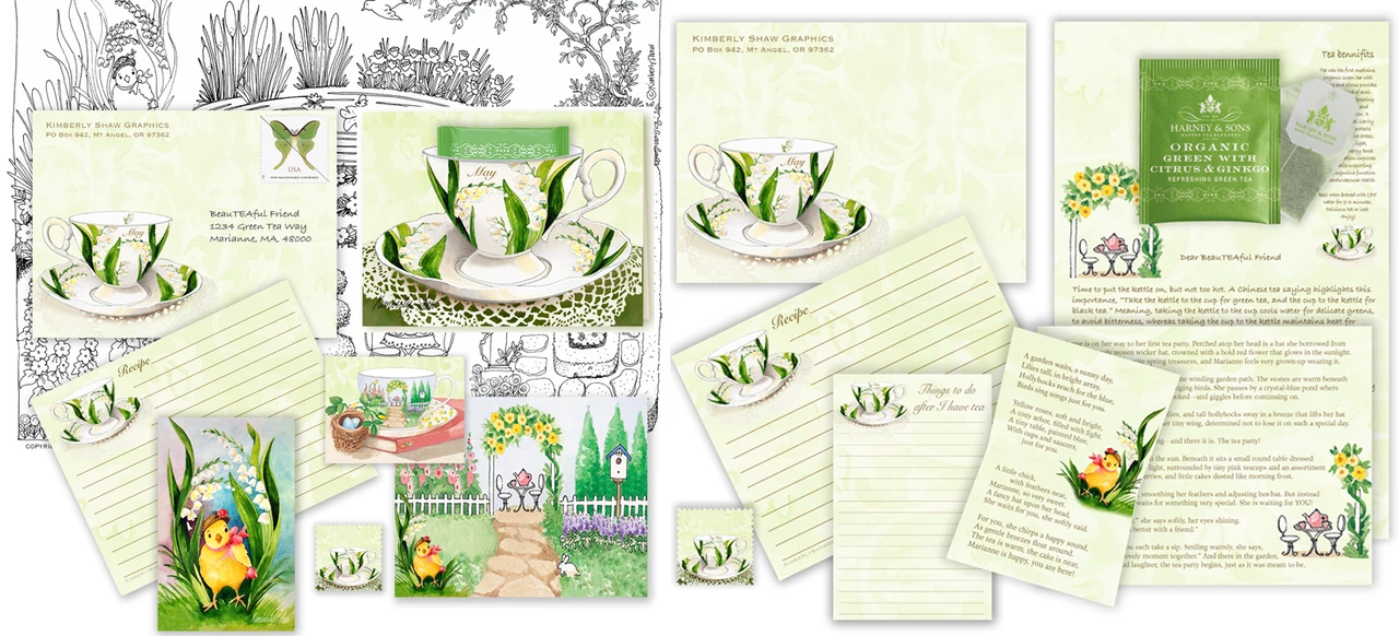 Something you can touch, keep, and savor from my art studio to your mailbox, or a friend's. Green tea is is paired with a tea loving chick named Marianne attending a garden tea party surrounded by lilies, hollyhocks and roses.