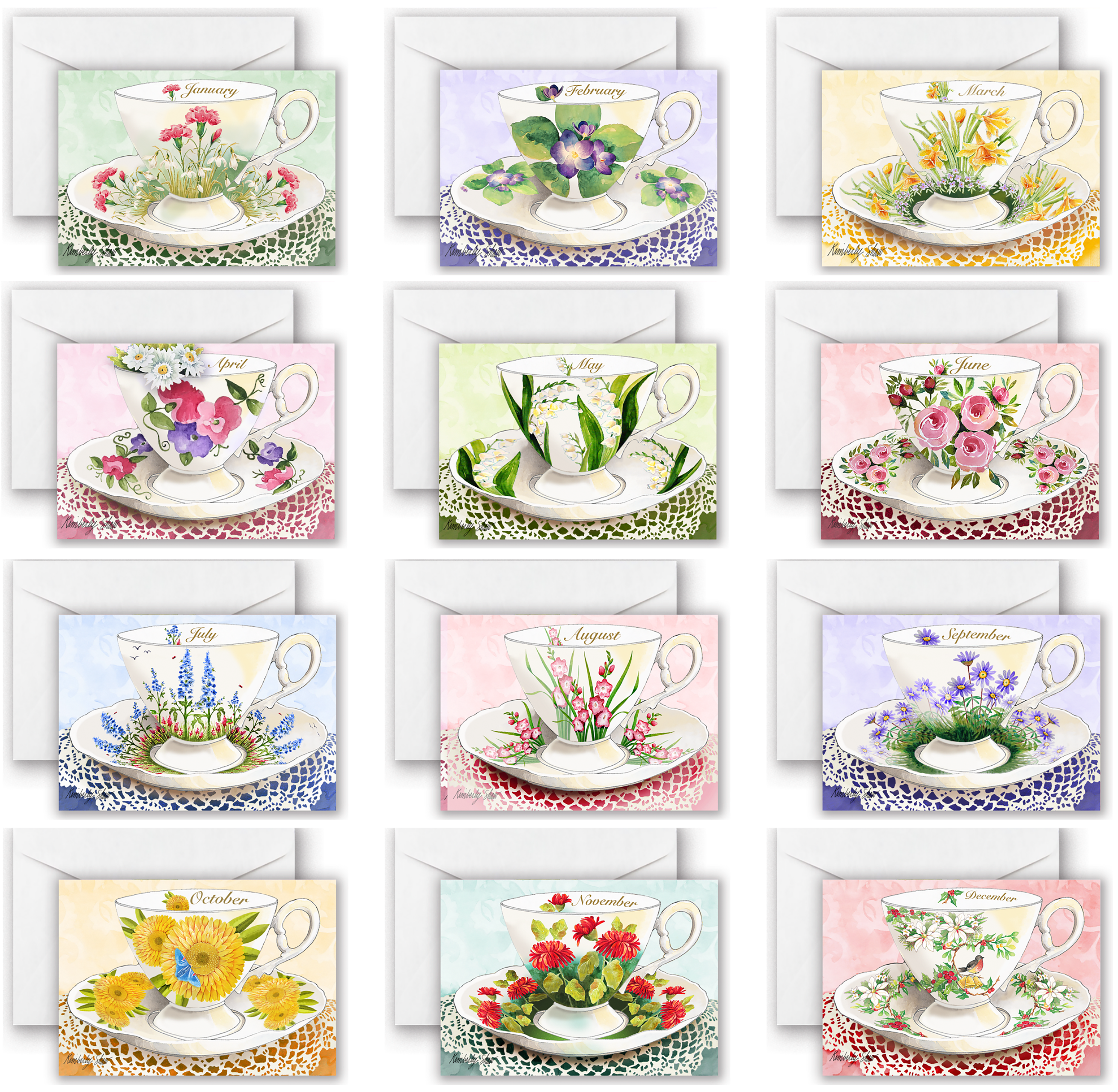A Teacup Notecard depicting the birthflower for each month. The symbolic meaning of each month's flower is written on the back in a pretty font. The whole set has a cohesive design that I've been longing to create. Seeing them all together makes the all the effort so rewarding. These were designed so you can give them as birthday cards or send as a monthly notes. I send them to elderly friends as reminders they are loved and cherished. Teabags aren't include with this set, but that doesn't mean you can't add one before sharing.